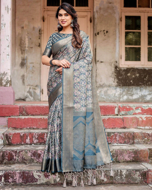 Elegant Blue and Grey Banarasi Silk Saree with Intricate Floral Patterns, Zari Woven Borders, and Tassel Accents