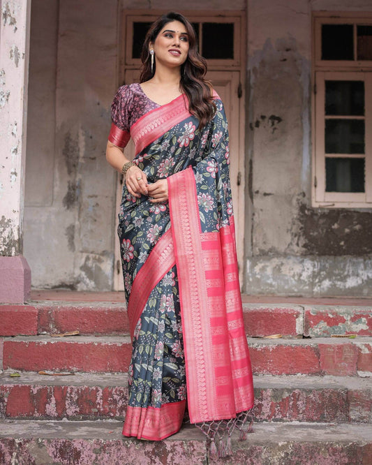 Floral Navy Banarasi Silk Saree with Bright Pink Zari Border and Tassels