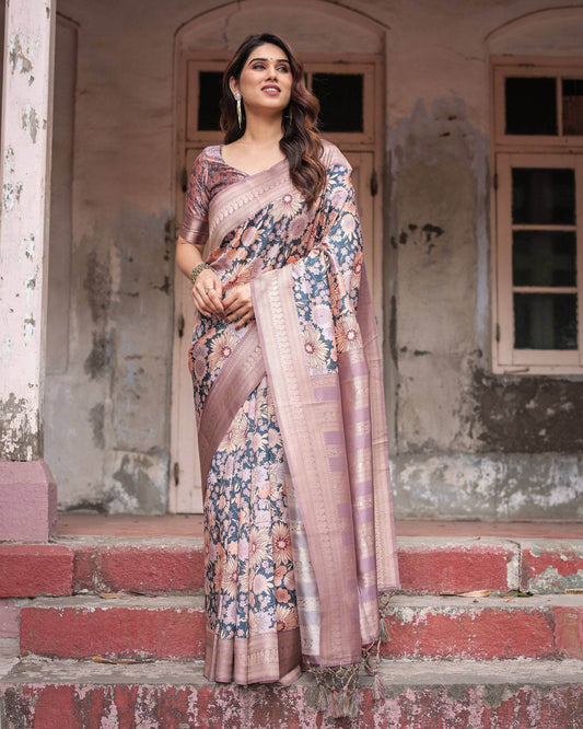 Pink Banarasi Silk Saree with Vibrant Floral Digital Print & Elegant Zari Border