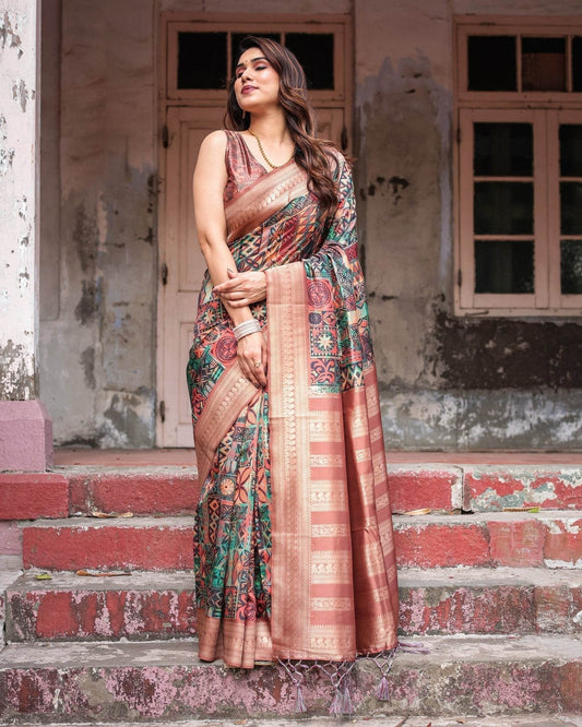 Green Banarasi Silk Saree with Lush Botanical Digital Print & Intricate Zari Border