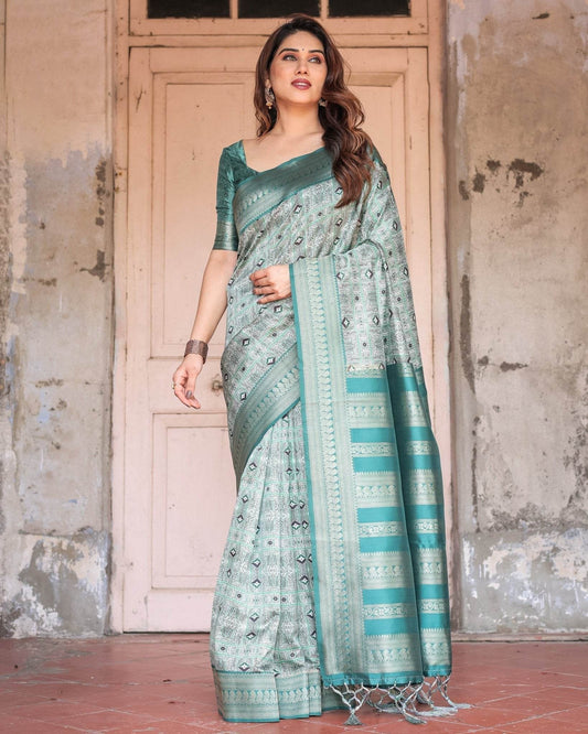 Mesmerizing Aqua Banarasi Silk Saree with Digital Print and Tassels