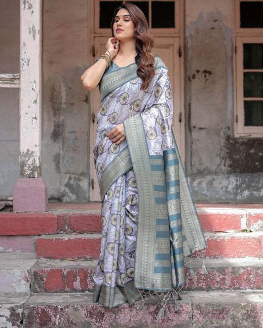 Sophisticated Lilac Banarasi Silk Saree with Floral Prints and Zari Tassel Border