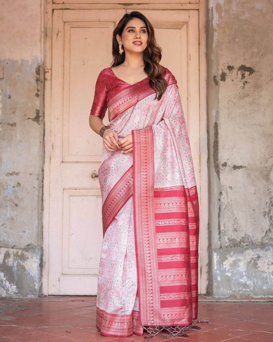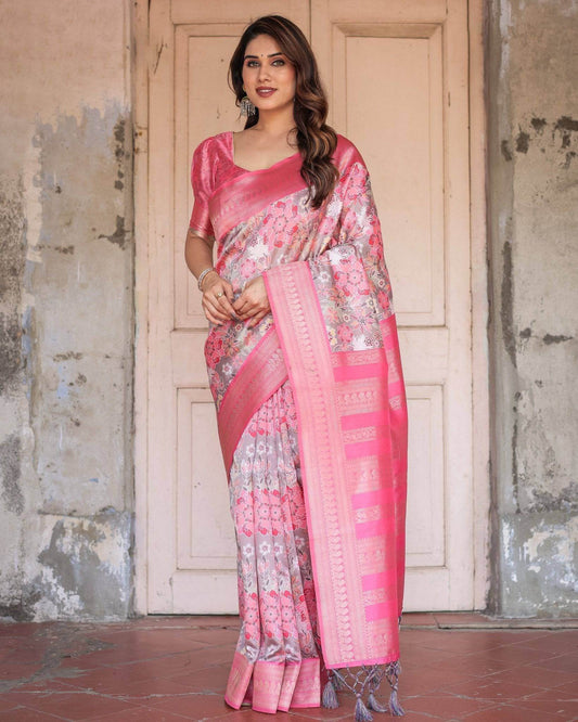 Exquisite Pink and Silver Banarasi Silk Floral Saree with Tassels