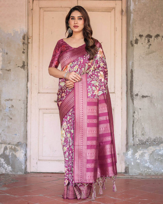 Wine Banarasi Silk Saree with Paisley and Floral Digital Print & Zari Border