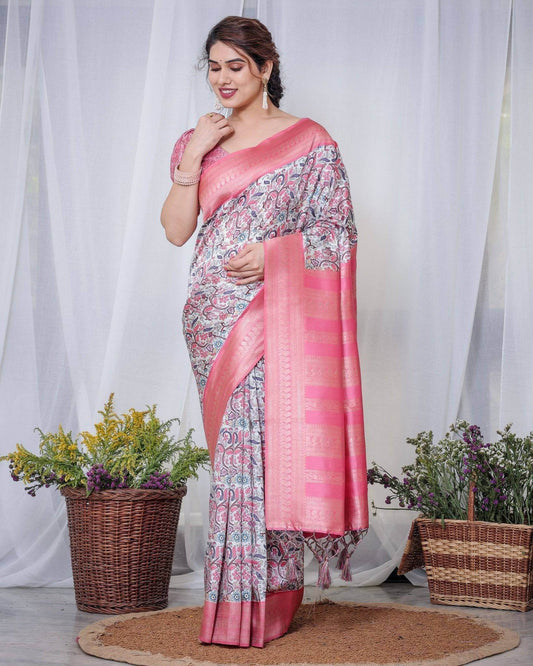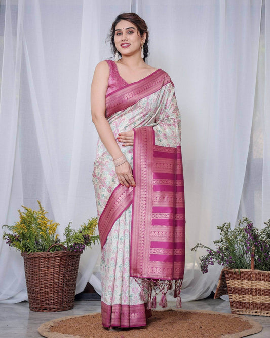Ivory Banarasi Silk Saree with Vibrant Paisley Digital Print, Pink Zari Border & Tassel Pallu