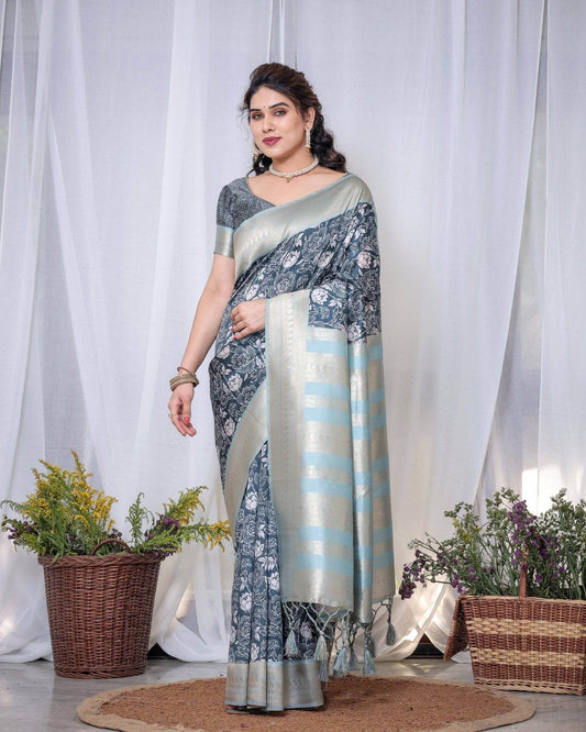 Steel Blue Banarasi Silk Saree with Tropical Floral Digital Print & Zari Border