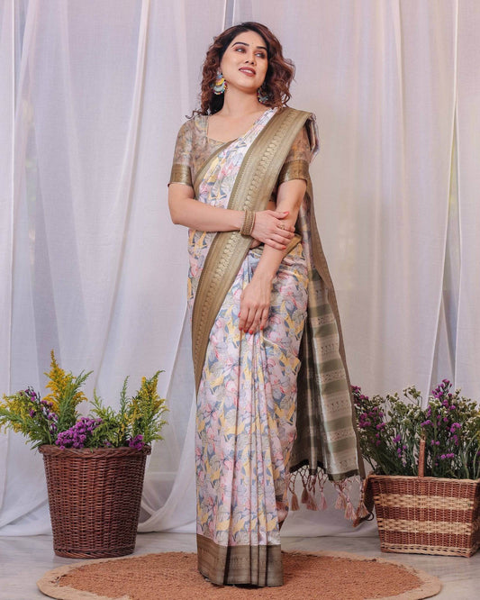 Sophisticated White and Olive Floral Digital Print Silk Saree with Zari Tassels