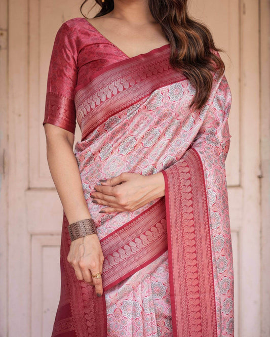 Crimson Red Banarasi Silk Saree with Geometric Digital Print & Zari Border