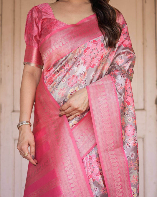 Pink Banarasi Silk Saree with Vibrant Floral Digital Print & Elegant Zari Border