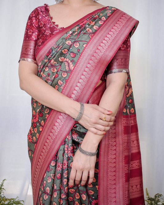 Banarasi Digitally Printed Green Silk Saree with Zari Weave and Elegant Tassels