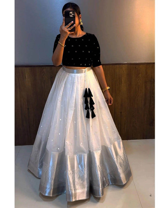 Velvet Designer Lehenga Choli – White and Black | SEEANS