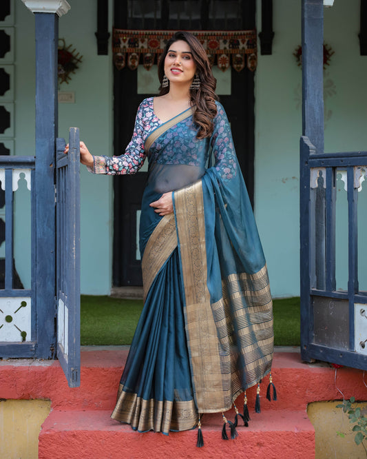 Teal Blue Plain Chiffon Saree with Gold Zari Border, Floral Printed Blouse & Tassel Detailing