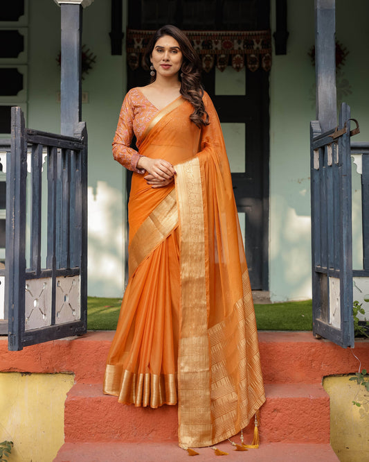 Elegant Tangerine Orange Plain Chiffon Saree with Gold Zari Border, Geometric Printed Blouse & Tassel Detailing