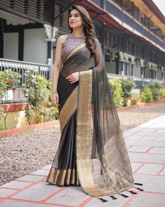 Ethereal Black Plain Chiffon Saree with Gold Zari Border, Floral Printed Blouse & Tassel Detailing