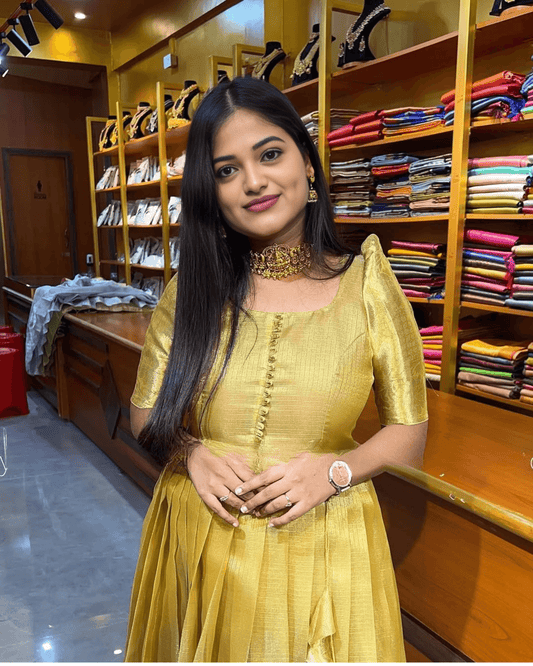 Soft Tissue Two-Tone Gold Saree with Embroidery Work | Velvet Stitched Blouse | Sequins & Coding Border