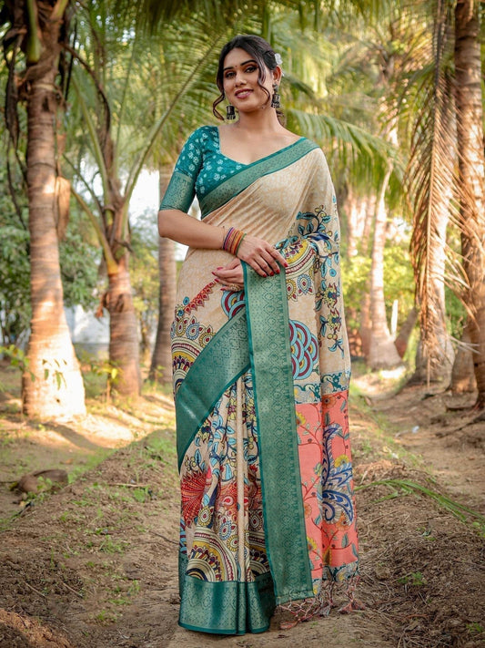 Beige & Teal Tussar Silk Saree with Intricate Kalamkari and Zari Border