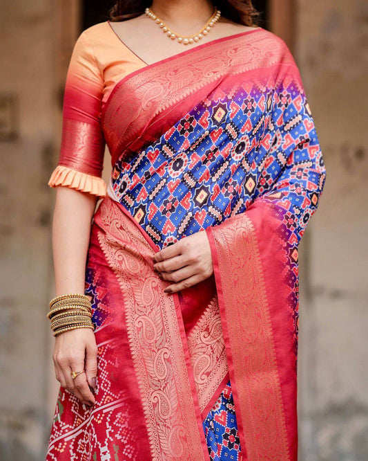 Royal Blue and Red Tussar Silk Saree with Geometric Patterns and Ornate Zari Border