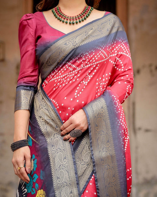 Crimson Red Tussar Silk Saree with Bandhani Patterns, Zari Border, and Vibrant Artistic Pallu