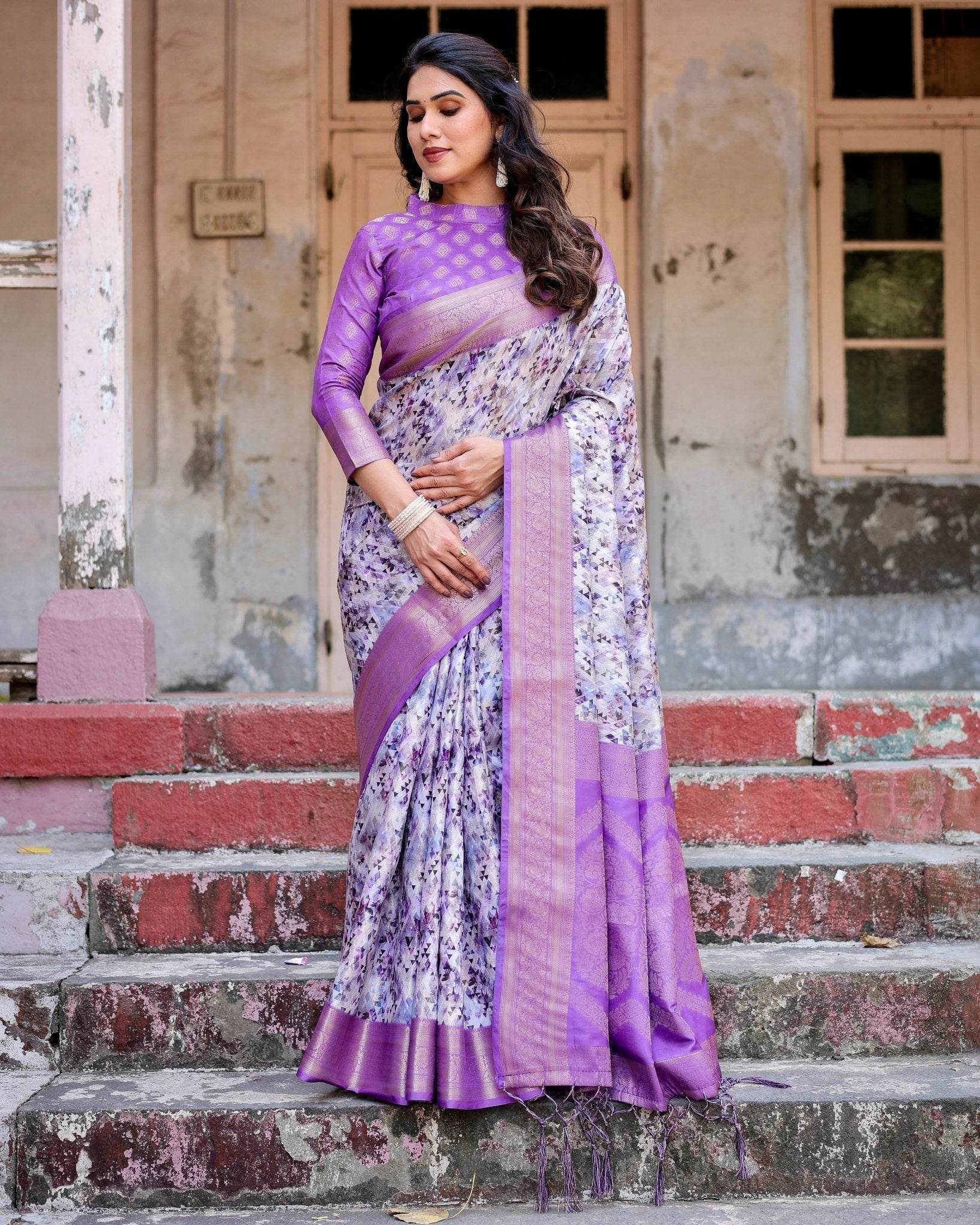 Lavender and White Geometric Floral Digital Print Banarasi Silk Saree with Zari Weave and Tassel-Embellished Pallu