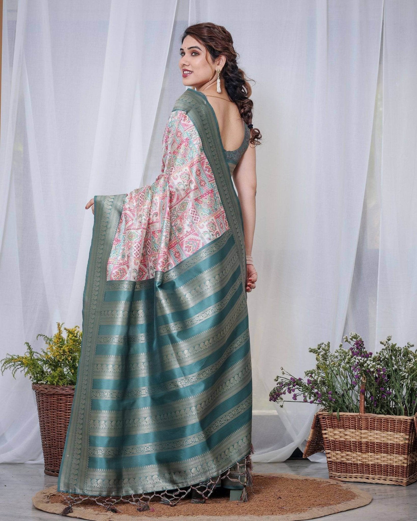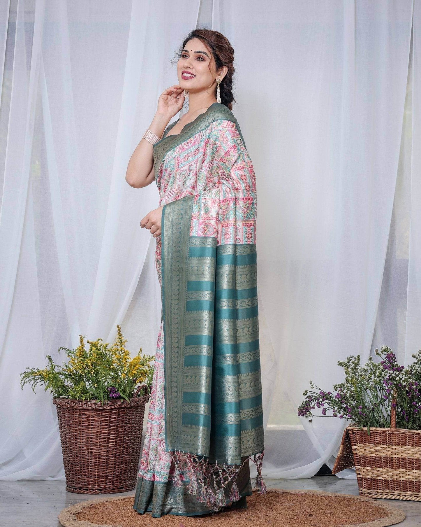 Teal Green Banarasi Silk Saree with Multicolor Digital Patchwork Print & Zari Border